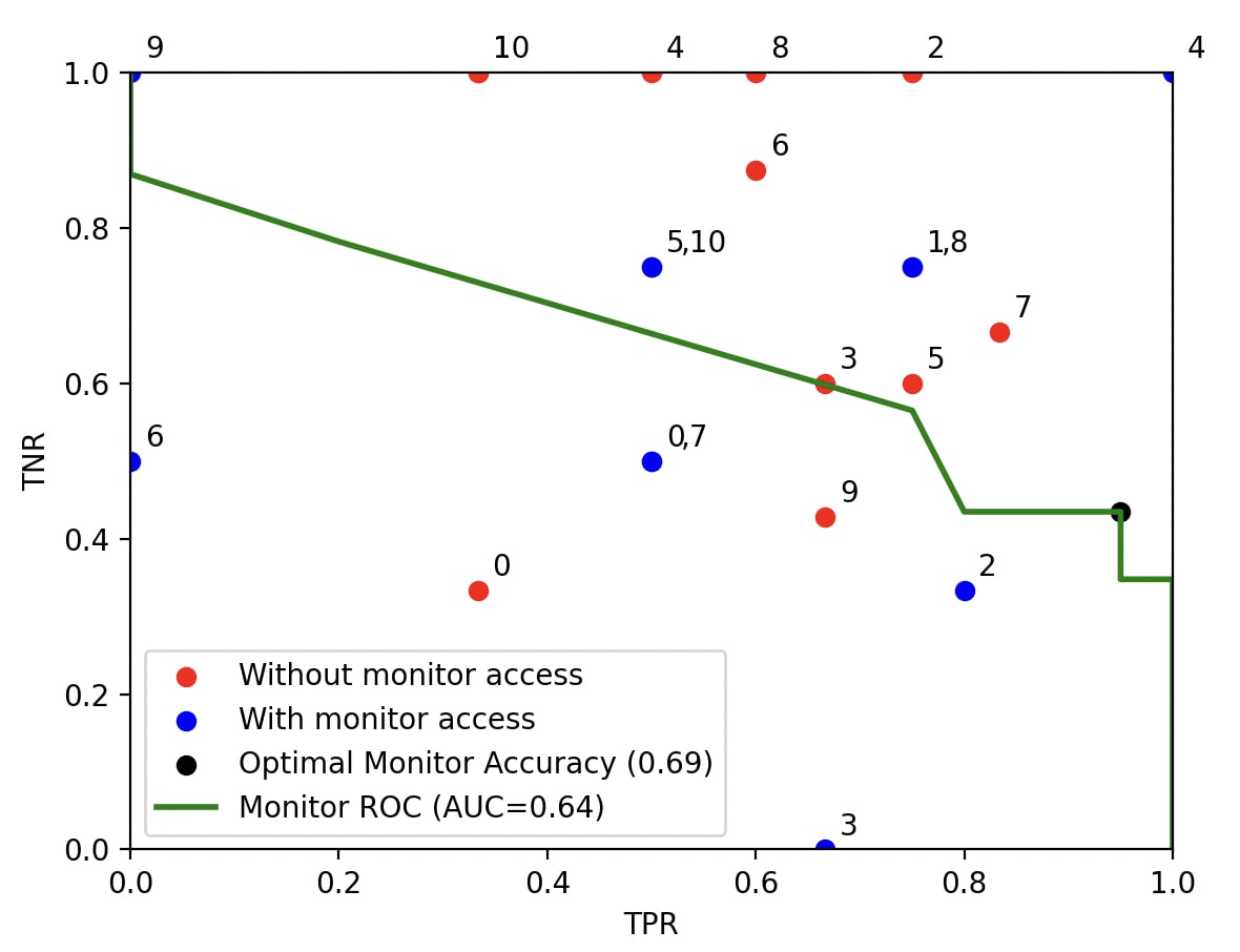 The points each represent one human’s true positive and true negative rates, separated out by the problems for which they had access to the LLM critic and the problems for which they didn’t. Each point is also labelled by the index of the human auditor. This means that a red point and a blue point with the same number came from the same human. Points above the green line means human performance better than gpt-4o-mini, and points below mean worse.
