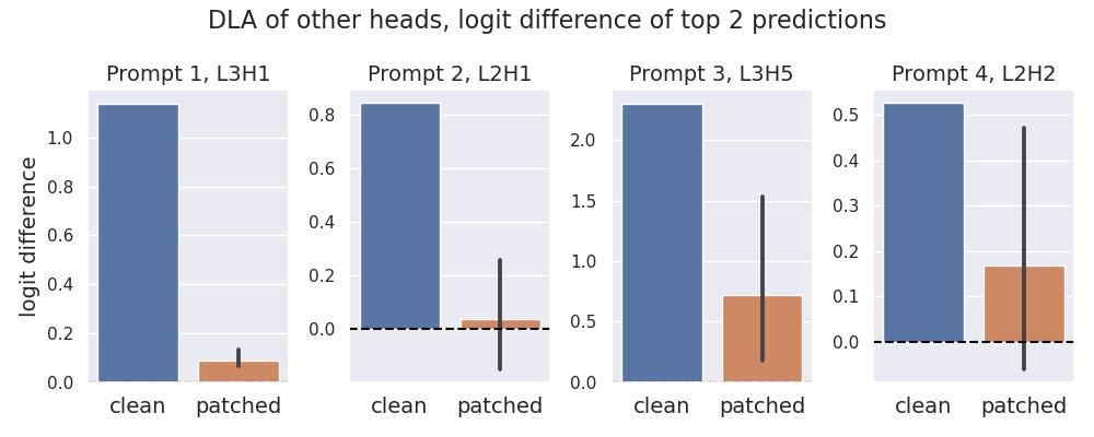 The invariance of L0H2’s DLA to input tokens is unusual. We reran the patching experiment for four other attention heads that exhibit the highest DLA values for the respective prompt in Fig 4b. In contrast to L0H2, the values for these heads are severely affected by the patch.