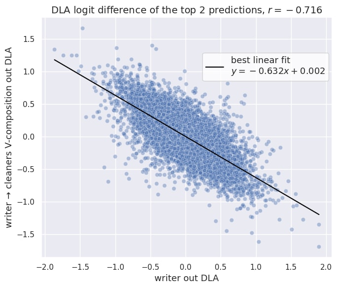 As we can see in Fig 5 (top of the page), it shows strong negative correlation () with the writer's DLA. In other words, writer's contribution to final logits is mostly[7] canceled by the clean-up heads.