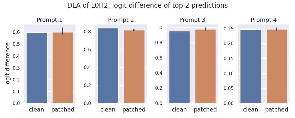 (logit difference 0.94)In our opinion, it is extremely unlikely that a node can directly[5] improve the model predictions in prompts 1-4 without considering token information[6]. However, patching the input to L0H2 with unrelated text doesn't affect the DLA values (see Fig 4a). We therefore conclude that L0H2 is not contributing directly to the model predictions in prompts 1-4, despite significant DLA values.