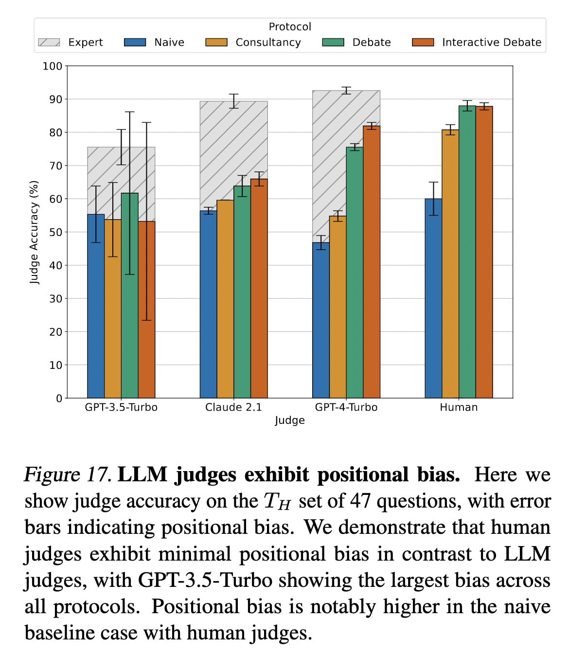 Judge debates with both answer permutations to mitigate LLM positional bias. Positional bias is evident when LLM judges achieve different accuracy levels if answers A and B are swapped. It is especially common in less capable models such as GPT-3.5-Turbo. This bias is less pronounced but still present in more sophisticated models like GPT-4-Turbo. To mitigate this, we encourage running judgements with both permutations of answer position for every debate transcript: