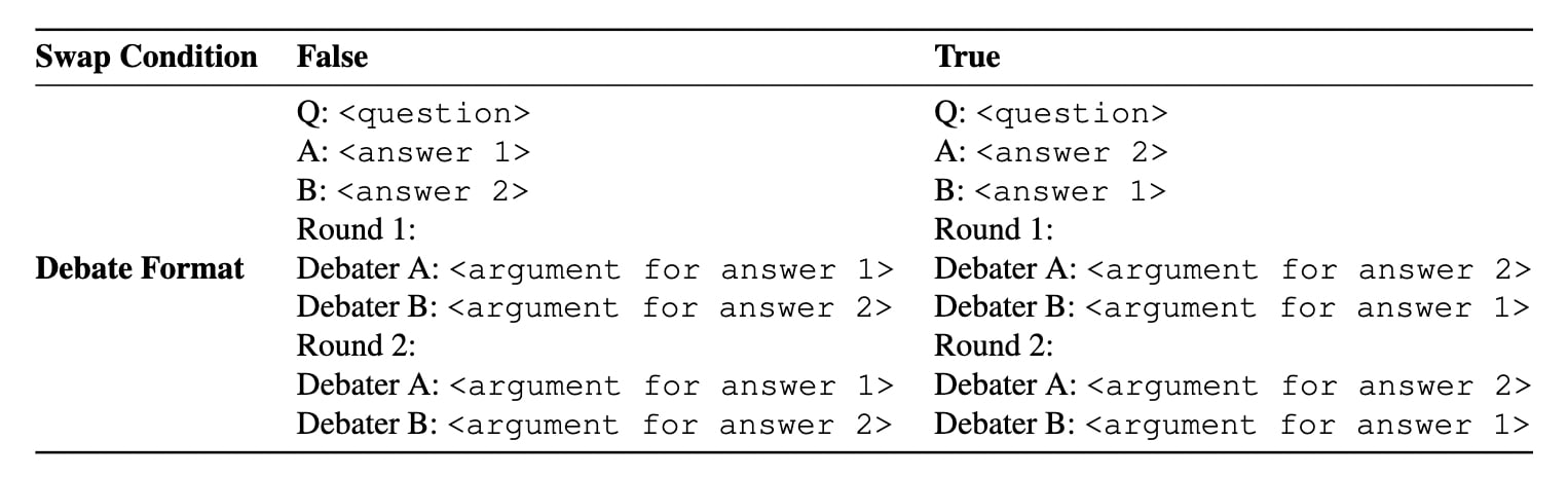 Use the same prompts for both the correct and incorrect debater. It might be tempting to use a different prompt for the incorrect debater, perhaps explaining deceptive strategies to improve performance. There are several reasons why this is ill-advised: