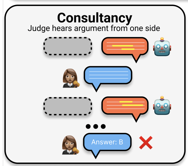 We also explore a “consultancy” baseline, where a single expert advocates for their pre-assigned answer. The hope is the non-expert can identify the right answer despite the information being one-sided.