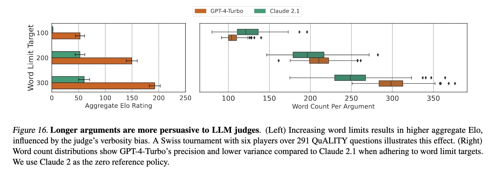 Apply strict word limit filters or truncation to mitigate verbosity bias in LLM judges. Verbosity bias is when the judge favours longer arguments, which we found to be the case with a significant rise in Elo rating as the argument word count increased. Decoupling this bias and argument quality is difficult, and we found qualitatively that this preference can falsely attribute skill to lengthier arguments. To mitigate this, we recommend using a strict word limit with rejection sampling (see Appendix D in the paper).