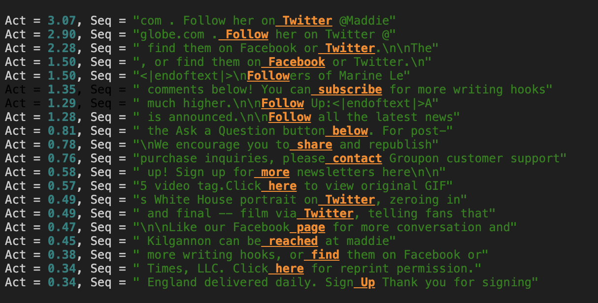 Fig 11: Key Feature with strong post-masking attention contribution to multiple heads. Also firing in the context of social media prompts, but seems to contain contextual clues as to the subject matter (Videos vs. news story etc) that are contextually relevant for completing “Subscribe to…” text.