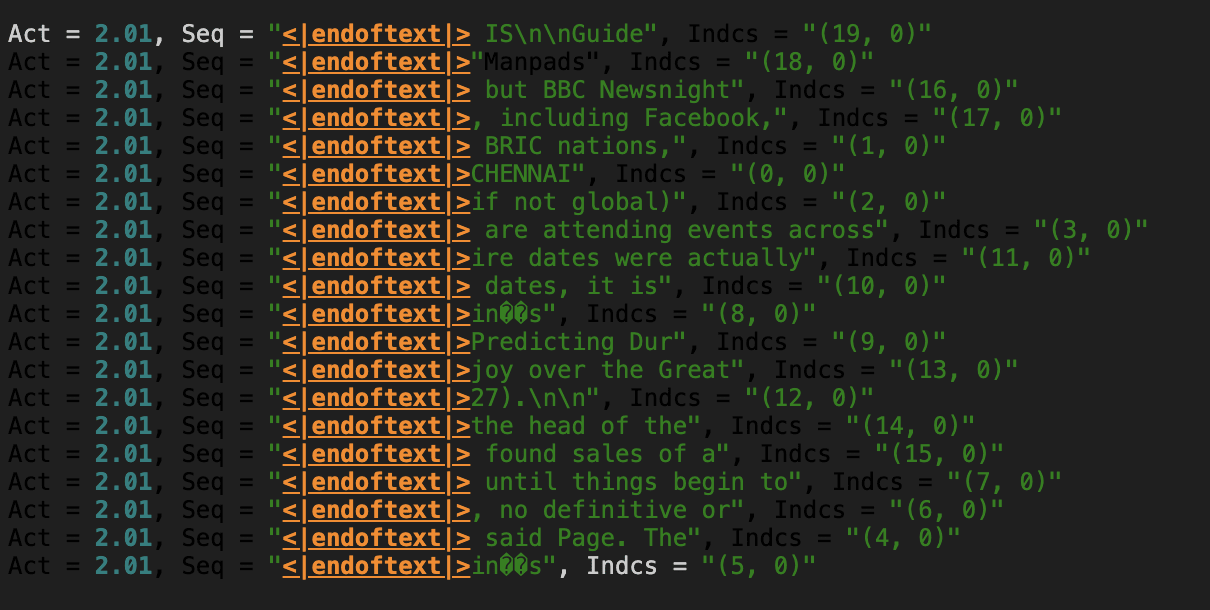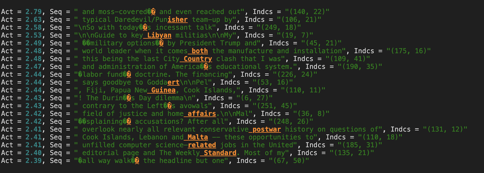However, we can examine our sparsified feature map to get a sense of what kinds of keys this mysterious dense feature “cares about”. Although there are a few, one of the strongest (which also affects multiple heads) yields the following max-activating examples:
