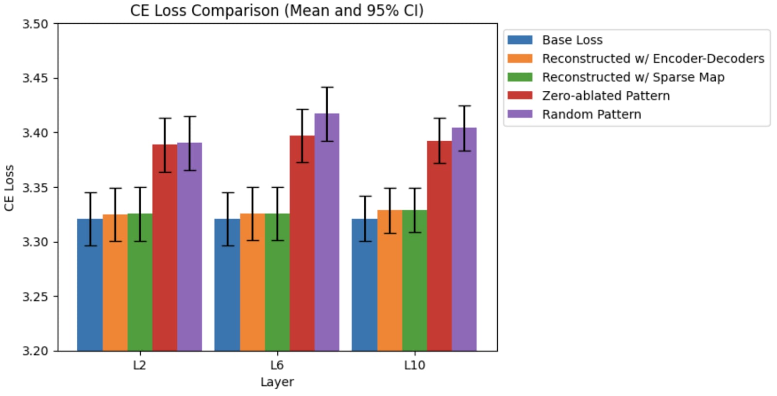 We calculate the performance degradation (in terms of both CE loss and KL-divergence of patched logits to true logits) from substituting our reconstructed pattern for the true pattern at run-time. We compare vs. zero-ablating the pattern as a base-line (although ablation of pattern does not harm model performance that much relative to ablating other components).