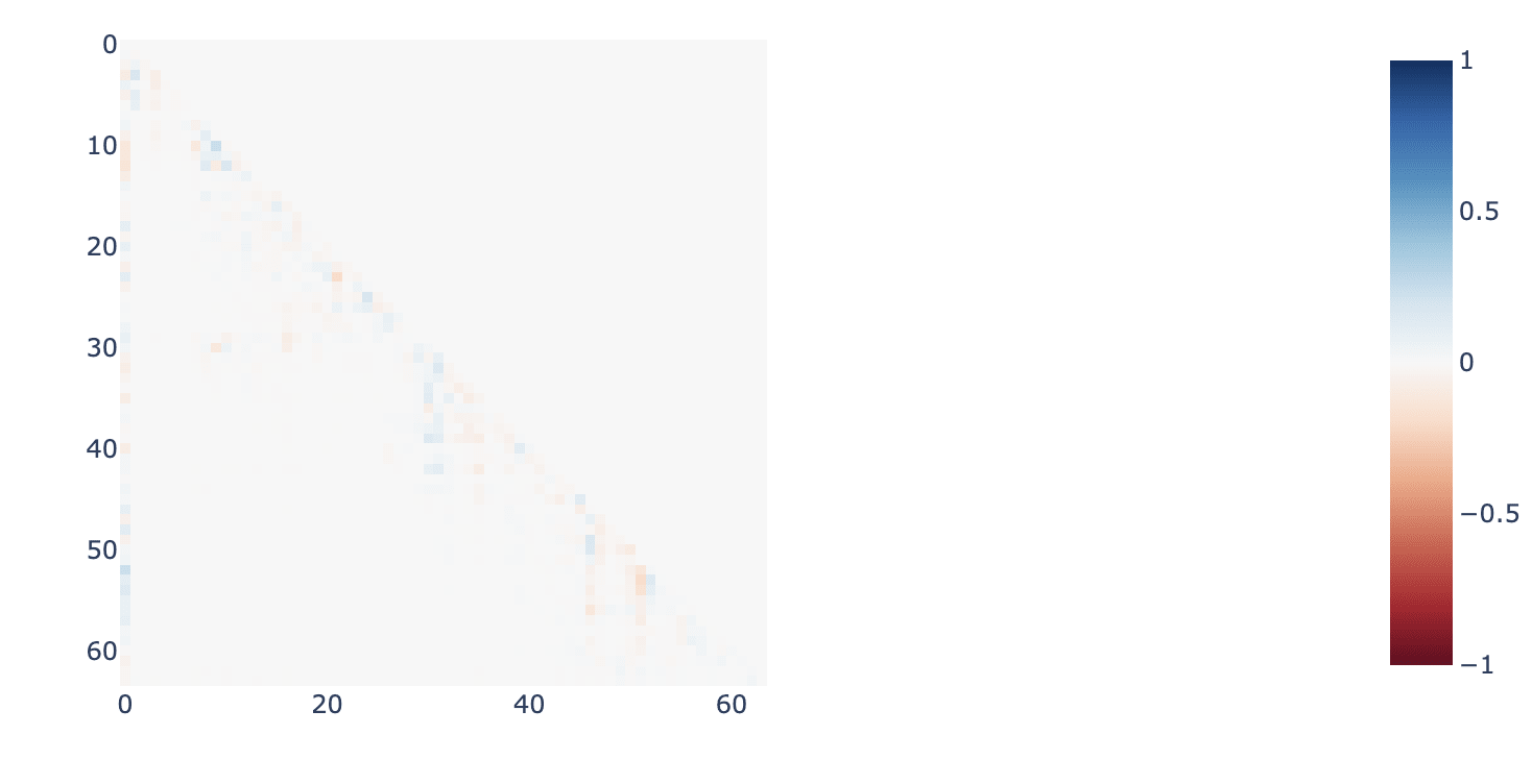 Fig 5. Top displays example pattern reconstruction for L6H0 on a random sequence from openwebtext (left = True pattern, right = Reconstructed with encoder-decoders). Bottom displays (true_pattern - reconstructed_pattern)