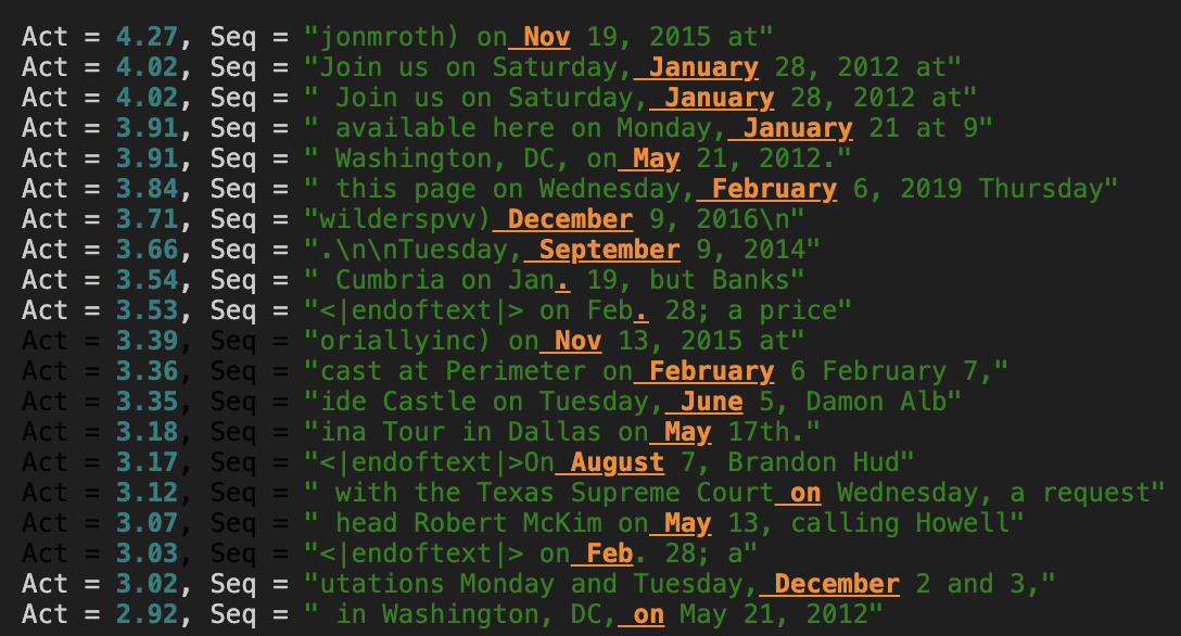 Fig 12: Query-Feature max-activating examples - feature fires on months (which usually precede a number)