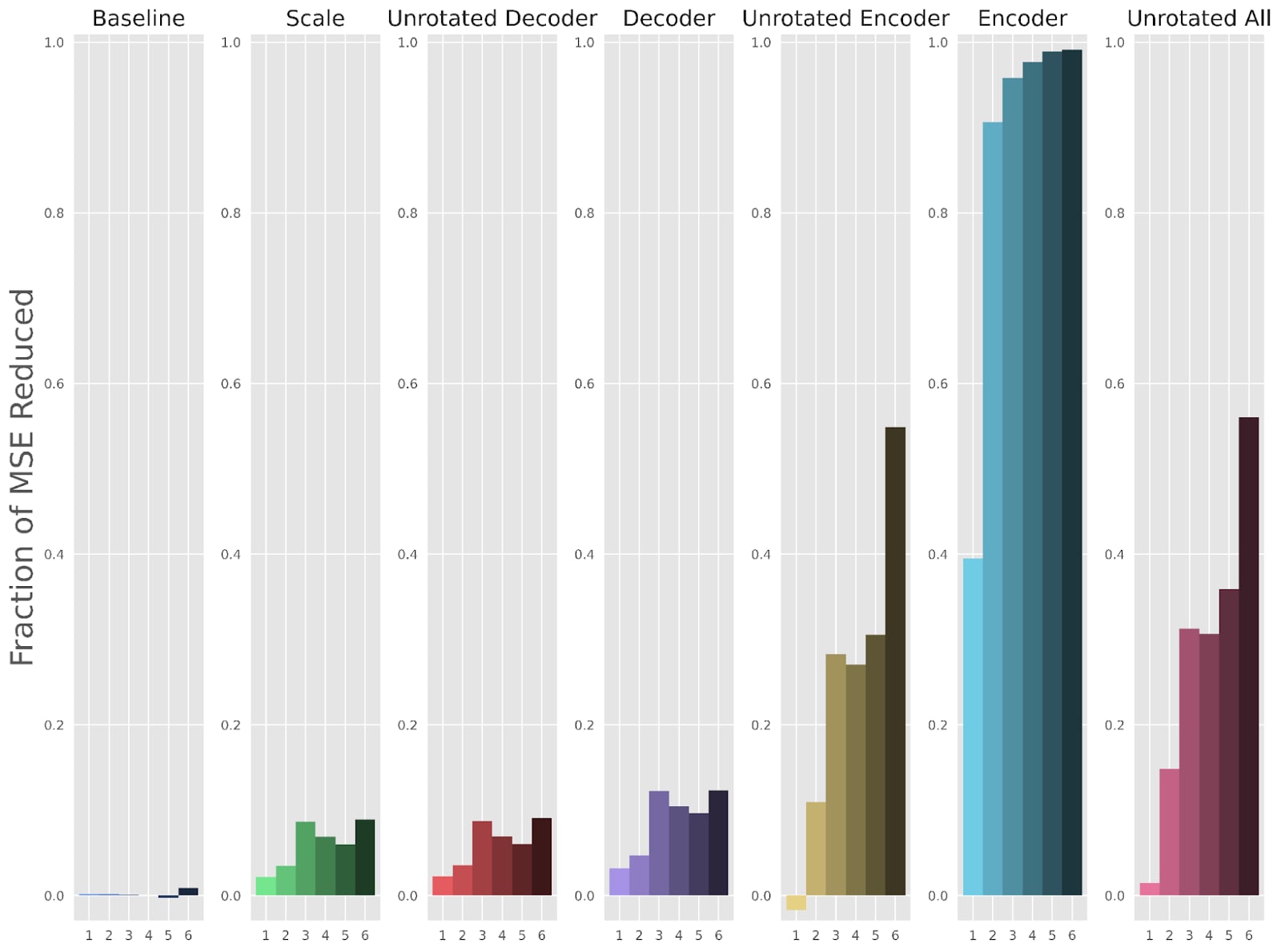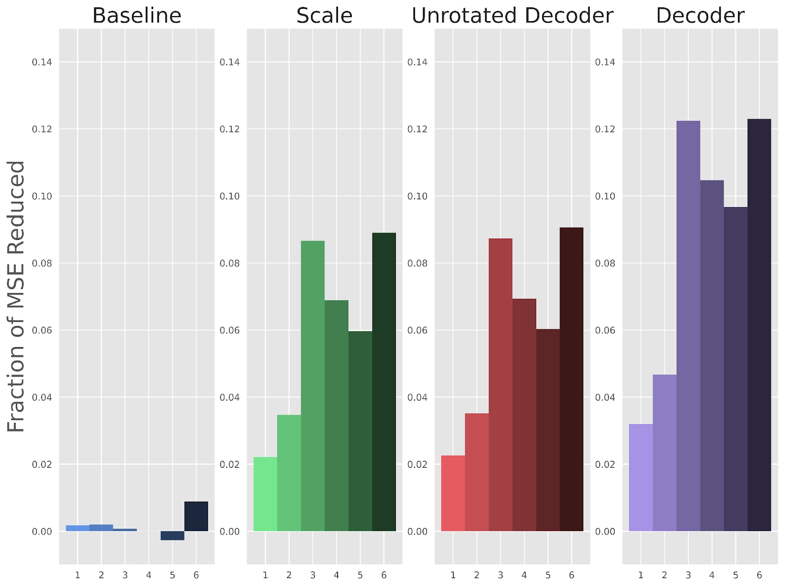 Figure 4: The fractional reduction of mean square error (MSE) reconstruction loss for each method of fine-tuning, plotted over all layers of Pythia 70m. The fraction of MSE reduced across layers are 0.002,0.061,0.088, and 0.060 for the “Baseline”, “Unrotated Decoder”, “Decoder”, and “Scale” methods, respectively.Figure 5: The fractional reduction in the perplexity gap between the original LLM and the patched-in reconstructed activations, for each method of fine-tuning and each layer of Pythia 70m. The original SAEs would have a score of 0, and perfect reconstruction would lead to a score of 1. The average perplexity recoveries across layers are 0.005,0.162,0.241, and 0.156 for the “Baseline”, “Unrotated Decoder”, “Decoder”, and “Scale” methods, respectively.