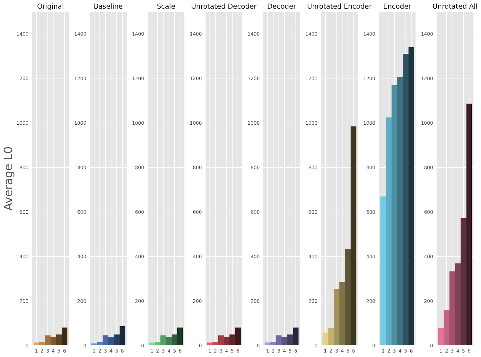 Figure 2: The average number of nonzero feature activations (L0) among fine-tuned SAEs, plotted over all layers of Pythia 70m. As shown, the “Unrotated Encoder”, “Encoder”, and “Unrotated All” methods drastically reduce sparsity compared to “Original” which showcases the original SAE sparsity.