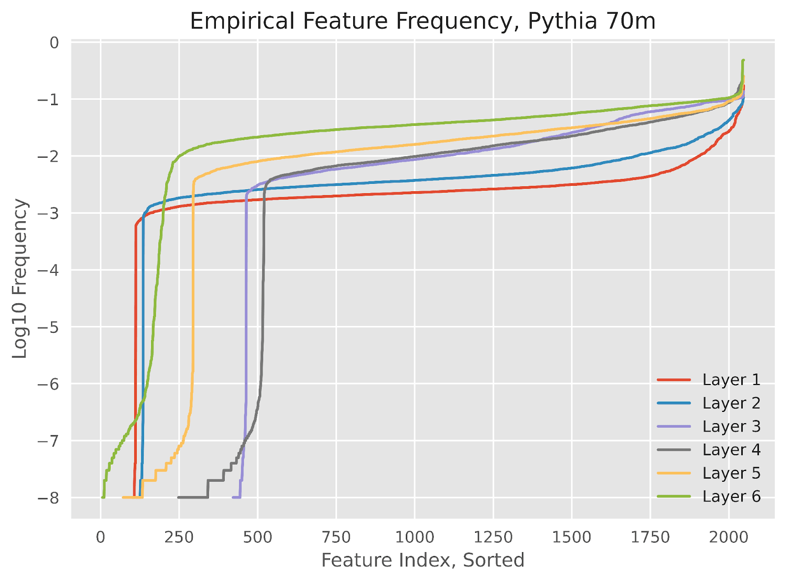 Figure 6: The log10 of the fraction of tokens on which each feature activated, sorted by frequency for each layer of Pythia 70m. Note that a frequency of 10−8 refers to a single activation on the whole dataset.