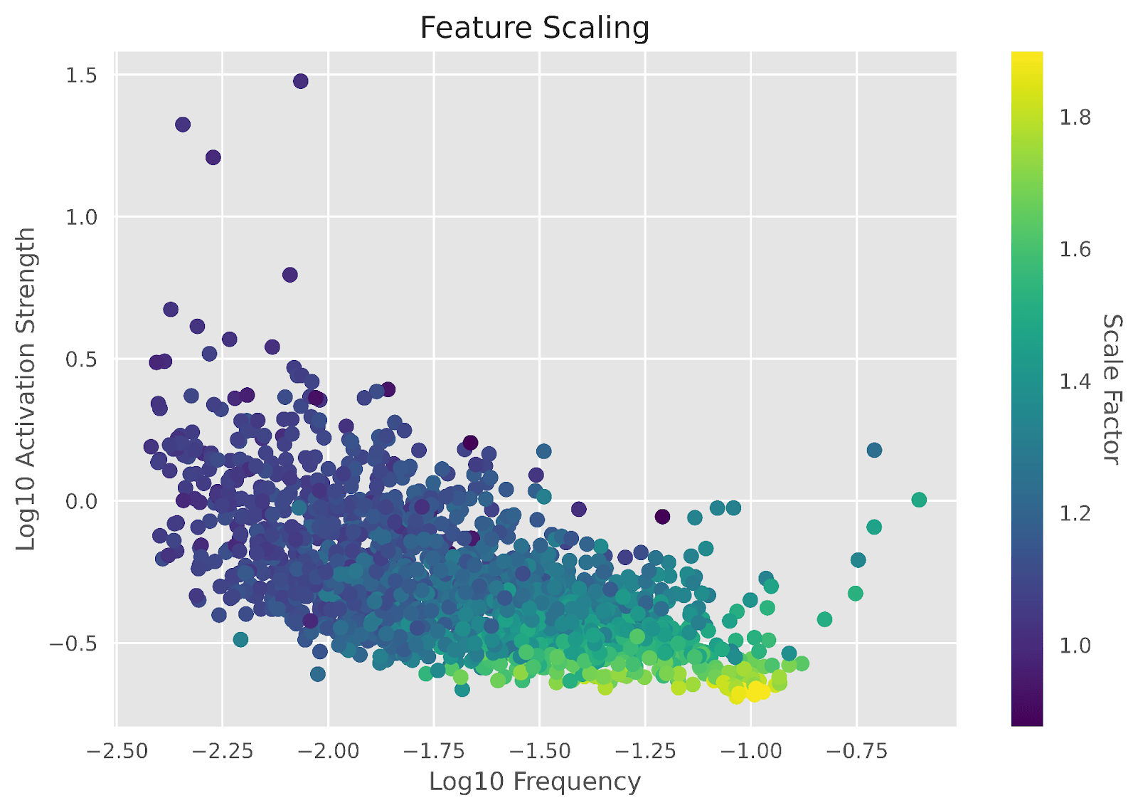 Figure 7: A scatter plot showing how much each feature was scaled by for the “Decoder” method of fine-tuning compared to the frequency of activating and how strong each activation was on average. We see that scaling is largely based on the activation strength.