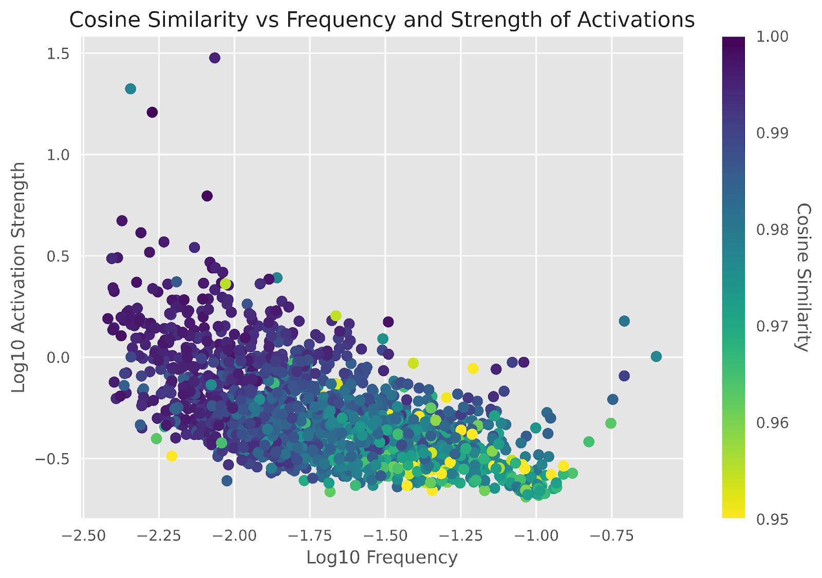 Figure A4: A scatter plot showing the cosine similarity between each strong feature before and after the “Decoder” method of fine-tuning compared to the frequency of activating and strength of activations. Any cosine similarity below 0.95 is clipped to the brightest color for ease of viewing. The features had an average cosine similarity of 0.983.