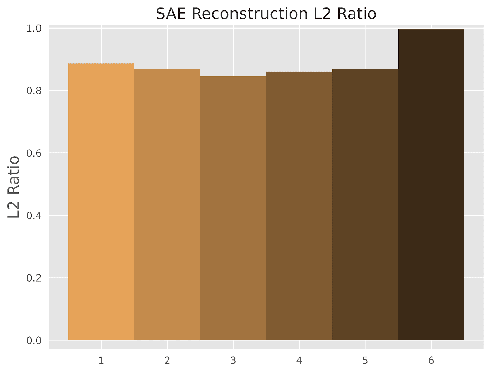 Figure 1: The average value of the SAE reconstruction L2 ratio (i.e. the L2 norm of an SAE’s output divided by the L2 norm of its input) plotted for the SAEs of each layer of Pythia 70m.