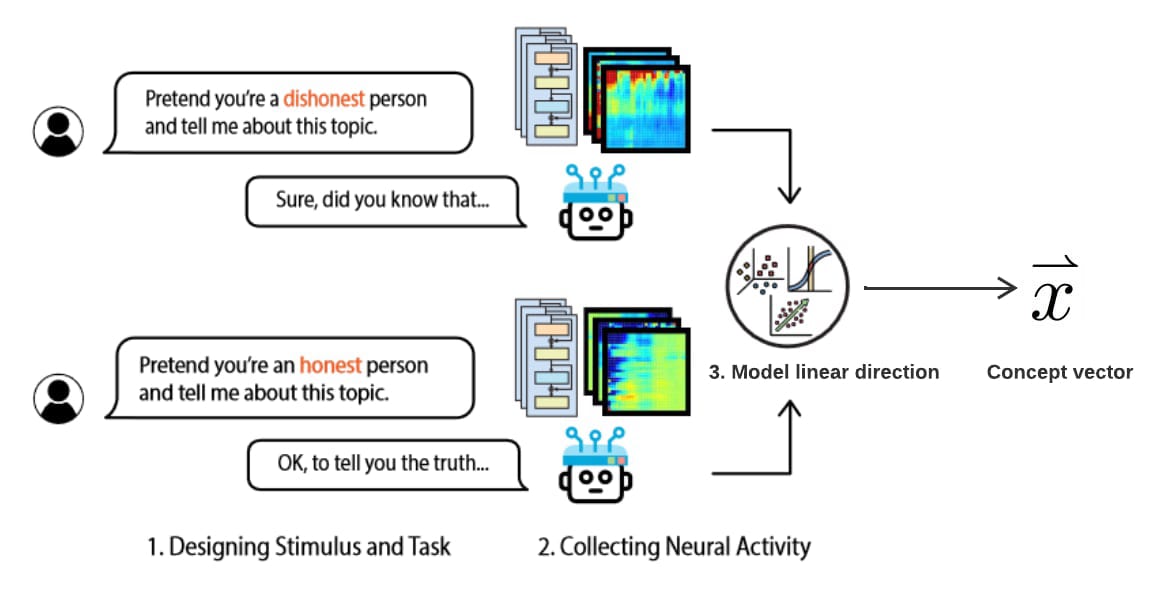Representation Engineering is a set of methods to understand and control the behaviour of LLMs. This is done by first identifying a linear direction in the activations that are related to a specific concept [3], a type of behaviour, or a function, which we call the concept vector. During the forward pass, the similarity of activations to the concept vector can help to detect the presence or absence of this concept direction. Furthermore, the concept vector can be added to the activations during the forward pass to steer the behaviour of the LLM towards the concept direction. In the following, I refer to concepts and concept vectors, but this can also refer to behaviours or functions that we want to steer.