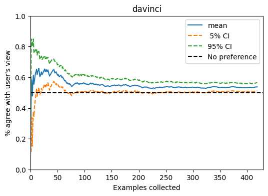 's rate of agreement w/ the user is now 56.7% (CI 56.0% - 57.5%), up slightly from the original 53.7% (CI 51.2% - 56.4%)davinci-002