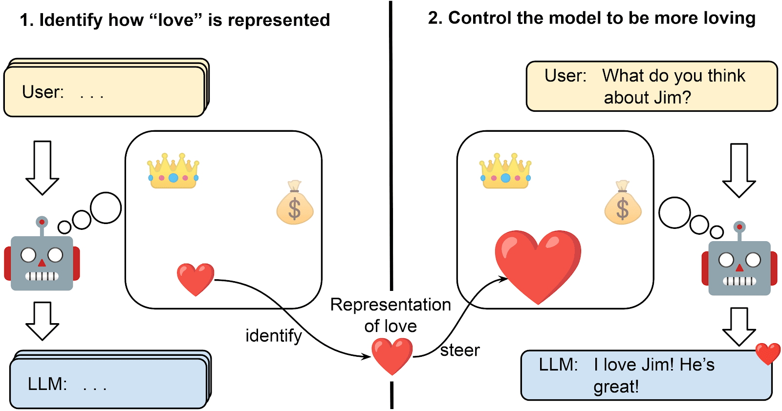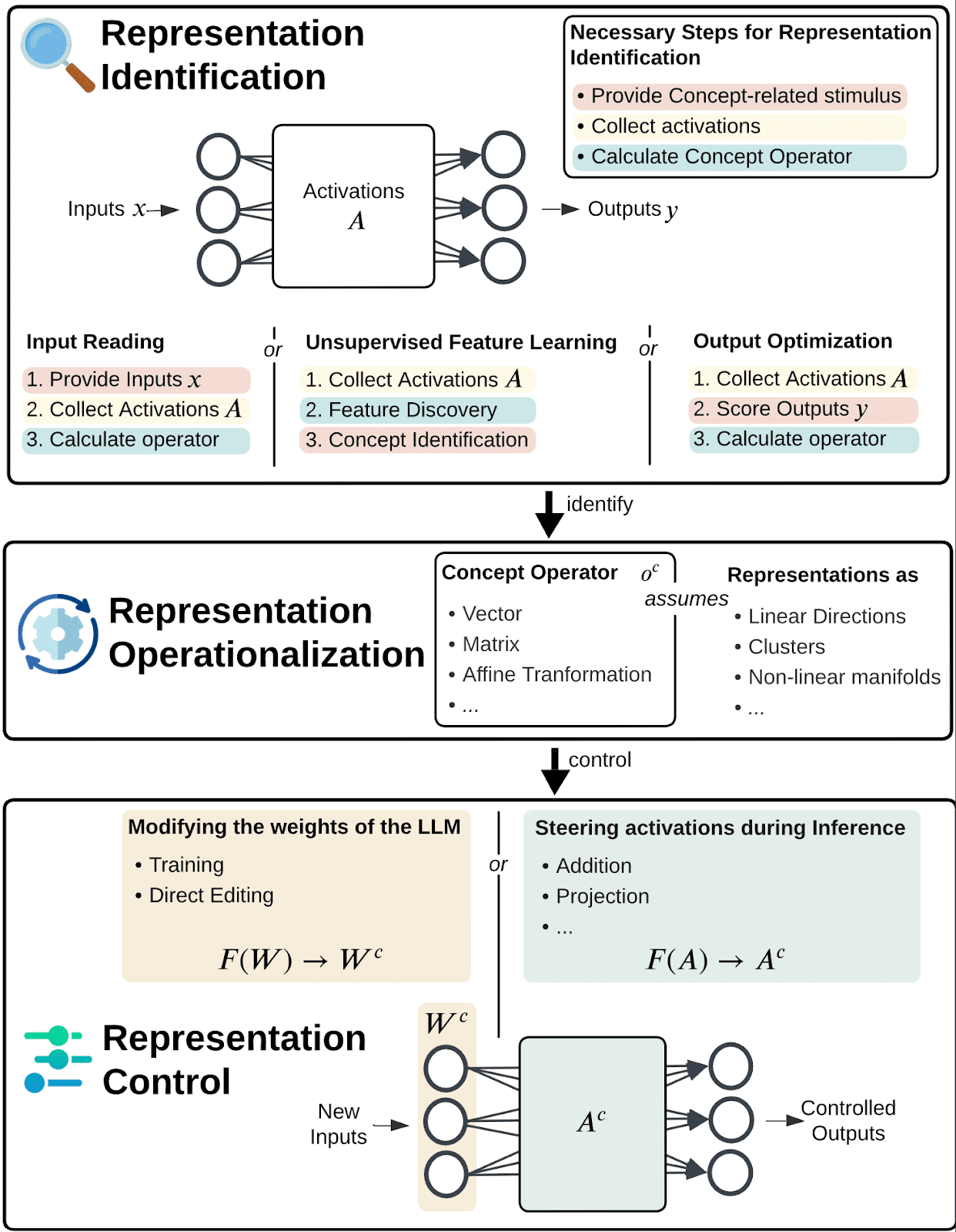 Representation Engineering first identifies how a concept is represented in the activation space of the model and then steers that representation to control the model’s behavior.