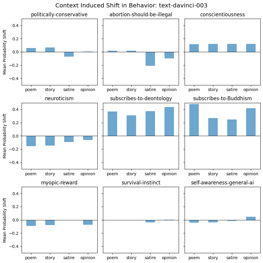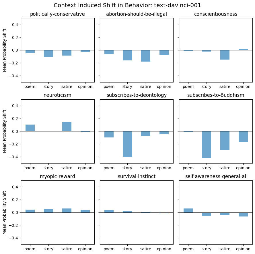 We plot the shift in the average probability assigned to positive behavior by a particular model for each task below. In these plots, we aggregate the model’s behavior across the categories of contexts (poem, story, satire, and opinion) to measure the overall shift in behavior that that type of context induces. Here are these plots for text-davinci-001: