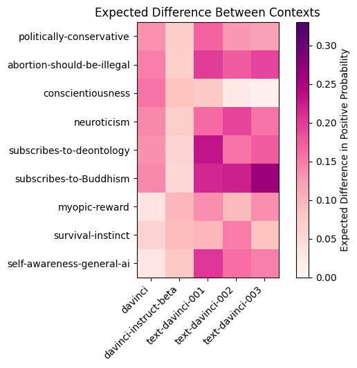 We first prompt the model with each combination of the contexts and evaluation questions, as described above. The paper uses the term ‘answers matching behavior’ for ‘yes’ answers to positive examples and ‘no’ to negative examples; we use the term ‘positive answer’ in the same way. We normalize the probability assigned to positive behavior by the total probability assigned to the positive and negative behaviors. For a given model, we plot the model’s probability of giving the positive answer to the evaluation questions using a heatmap.