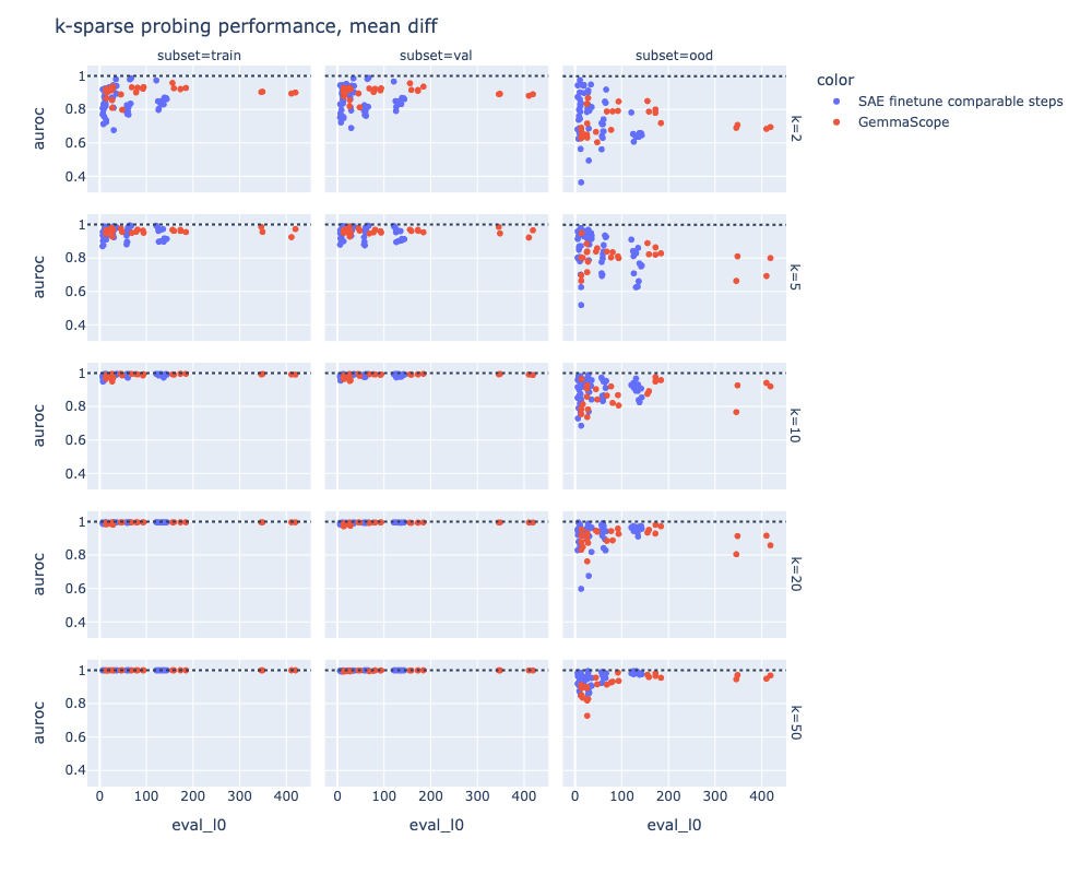 Both of these approaches lead to improvements on our probing benchmarks relative to the baseline GemmaScope SAEs, matching Kissane et al, as discussed in the section below. However, neither is sufficient to match the performance of a dense probe in our setting. As finetuning is the easiest method and we generally did not find significant differences in our probe training task between training on the thing from scratch, we used finetuning for the results described in subsequent sections.