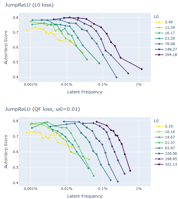 Nevertheless, by sharing our ideas and results, we hope that practitioners who run into issues with high frequency latents may try variants on the standard JumpReLU loss like quadratic-frequency (or iterate further on them) and see if they provide an improvement for their use case.