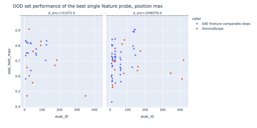 In the plots below, we plot the best single-feature probe of the original GemmaScope SAEs, and a set of SAEs finetuned on chat data (see the finetuning snippet for more details), with the performance of the dense probe shown as a dotted line. We see that while using finetuned SAEs leads to a significant improvement in single-feature probe performance at this task - suggesting that these SAEs more closely capture the concept that we care about in a single feature - they remain below the performance of a dense linear probe, as shown by the dotted line in these plots.
