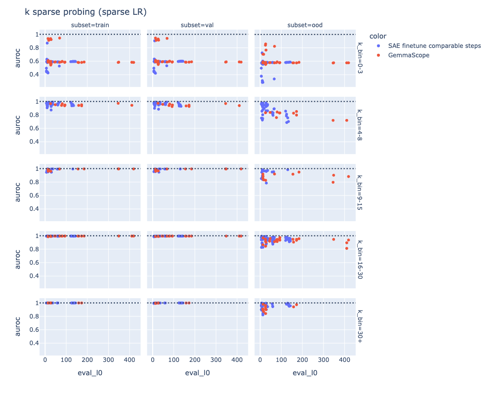 Both of these approaches lead to improvements on our probing benchmarks relative to the baseline GemmaScope SAEs, matching Kissane et al, as discussed in the section below. However, neither is sufficient to match the performance of a dense probe in our setting. As finetuning is the easiest method and we generally did not find significant differences in our probe training task between training on the thing from scratch, we used finetuning for the results described in subsequent sections.