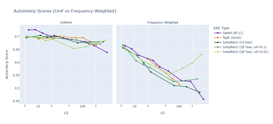In the next section, we’ll compare autointerpretability scores across models with different latent density distributions (in particular, some models with more high-frequency features than others). This introduces a problem - traditionally autointerp is measured as an average score over all latents, but this doesn’t capture the fact that eliminating a high-frequency uninterpretable feature is intuitively better than eliminating a low-frequency uninterpretable feature. One way to think about this is, if we sampled a prompt from the pretraining distribution and gave it to the model, and look at the latents, we’d hope that they tend to be interpretability. But the correct way to measure this is by taking the autointerp score for each latent weighted by how frequent they are, not uniformly weighted. We have found taking frequency weighted auto-interp scores to be instructive, and recommend that practitioners plot this, in addition to uniform weighted.