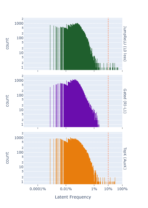 This L0 sparsity penalty only cares about controlling the average firing frequency across all latents in a SAE; it is actually indifferent to the range of firing frequencies in the SAE. In other words, L0 doesn’t care whether a low firing frequency is achieved by: (a) all latents firing infrequently, or (b) some latents firing frequently and other latents firing very infrequently to compensate. As long as the average firing frequency is the same either way, L0 doesn’t mind.[2]
