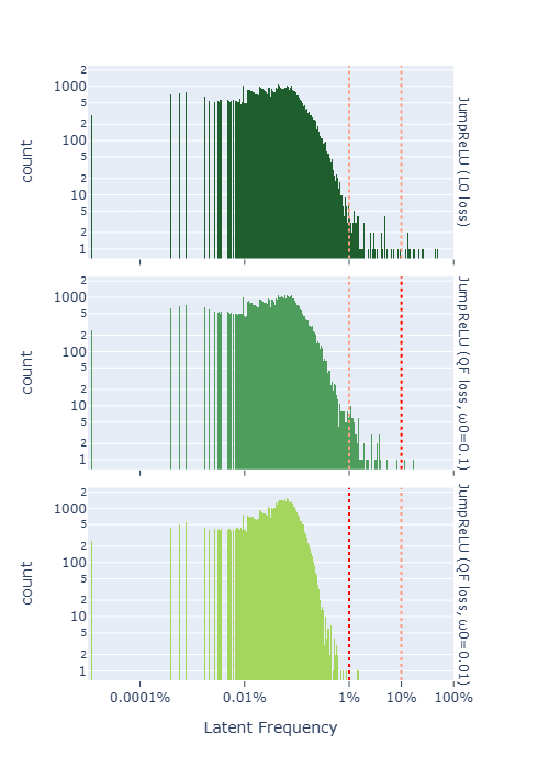 Nevertheless, by sharing our ideas and results, we hope that practitioners who run into issues with high frequency latents may try variants on the standard JumpReLU loss like quadratic-frequency (or iterate further on them) and see if they provide an improvement for their use case.