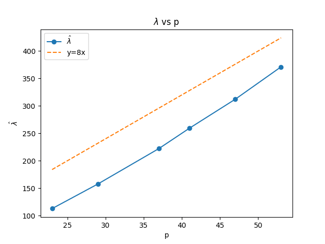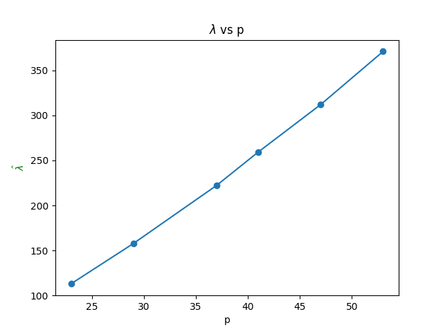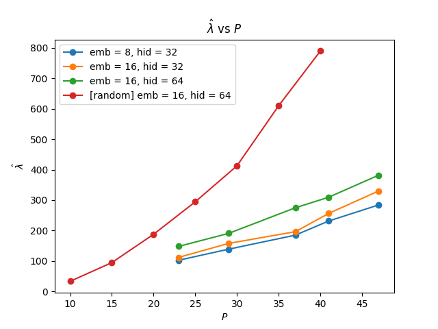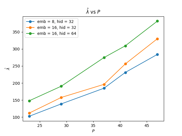 Note that the primes we include are relatively small. While our architectures are efficient and always generalize (with close to 100% accuracy) for much larger primes, we empirically observe that the estimates for tend to be much better and less noisy when the fully trained network is very close to convergence (0 loss). Because of computational limitations, we use a relatively large learning rate (0.01) for a relatively small number of iterations. This results in worse loss at convergence for primes above 50; we conjecture that the near-linear behavior would continue to hold for much larger primes if we used more computationally intensive methods with a smaller learning rate and a larger number of SGD steps.