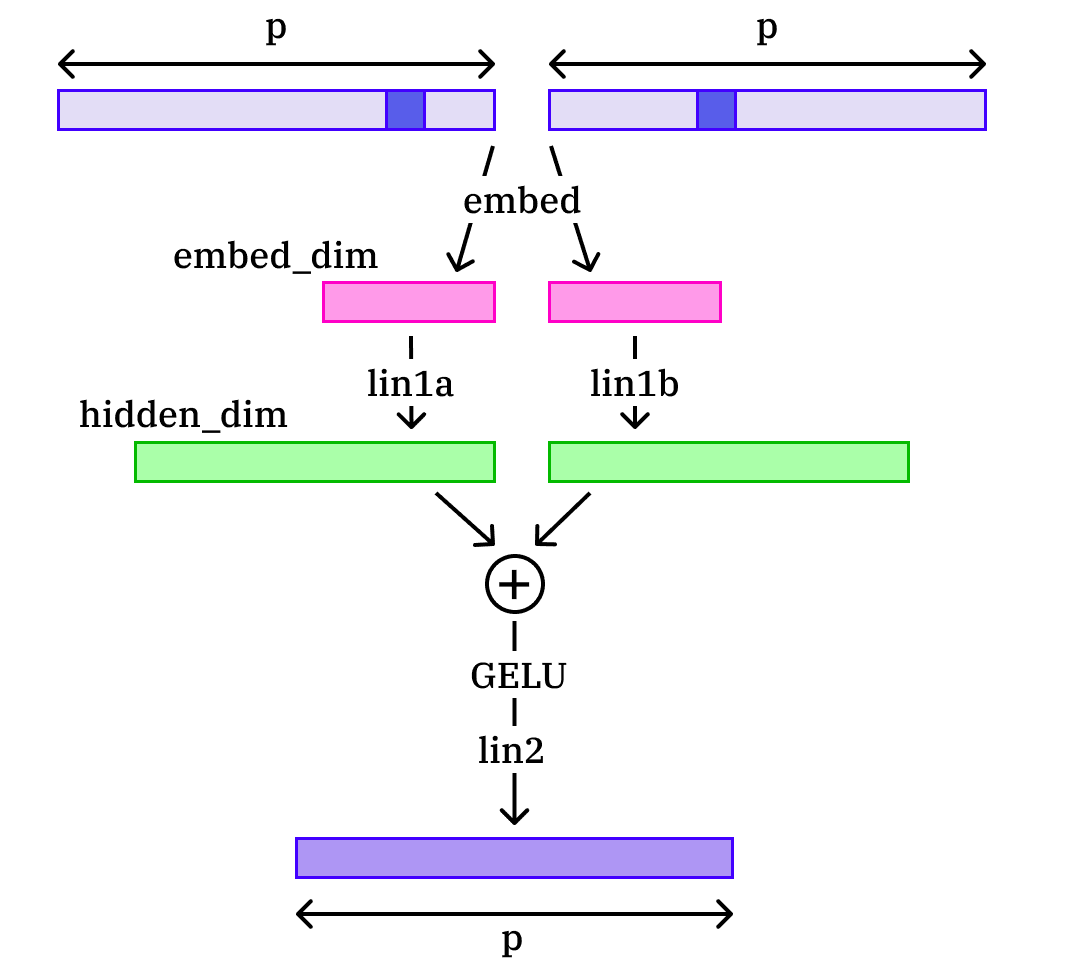 In principle, the minimal effective dimensionality of a model with this architecture that solves modular addition is (this will be elaborated on in a separate theory post deriving results about modular addition networks). However, we observe that the empirical scaling factor is very close to , double the result for a single circuit. A possible explanation for this result could be that, in the regime our models inhabit, the effective space of solutions consists of weight parameters that execute at least two simple circuits (all models we trained learned at least 4 simple circuits).