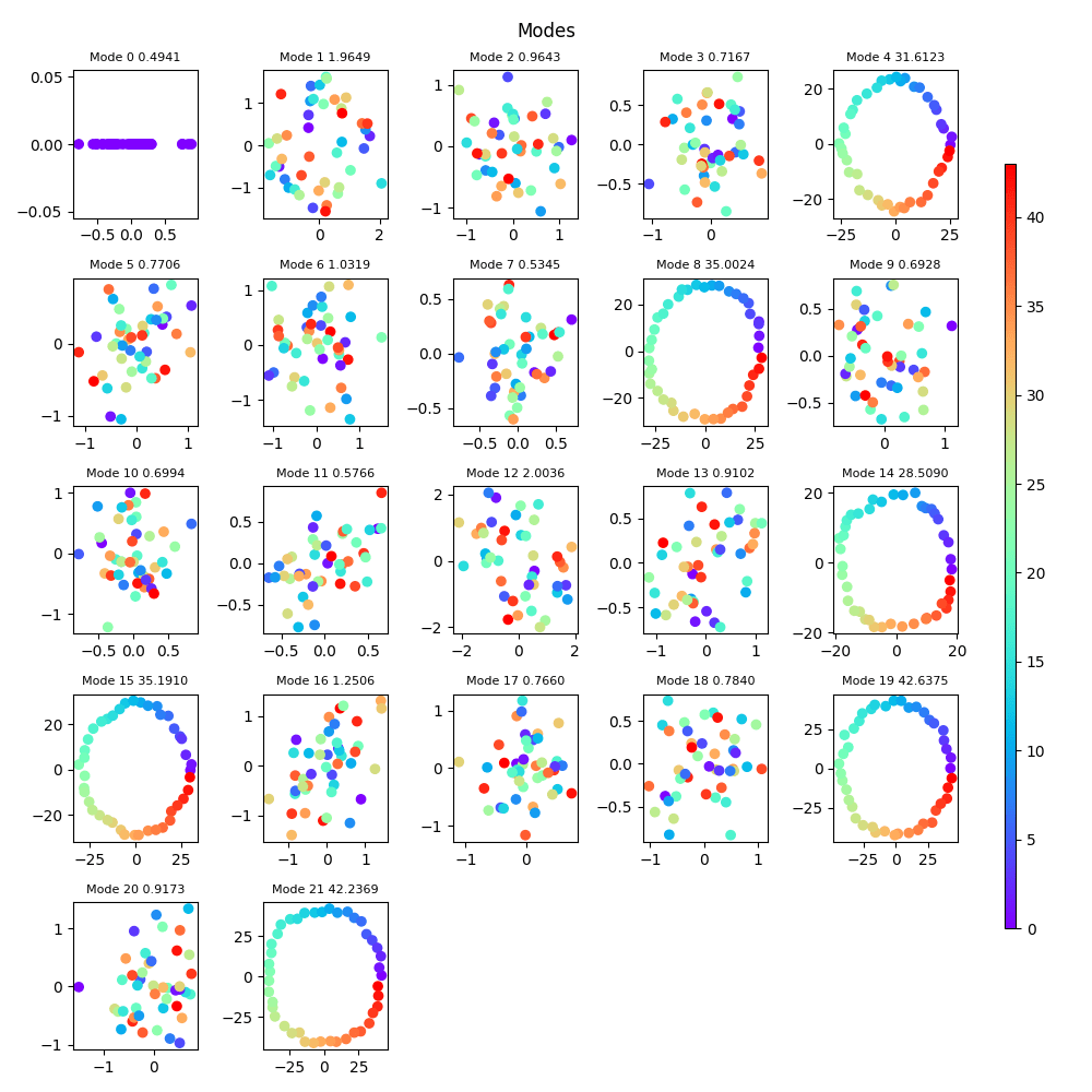 We can measure the number and types of circuits learned by a network, either by considering large outlier Fourier modes in the embedding space or (more robustly) by looking for near-perfect circles in "Fourier mode-aligned" two-dimensional projections of the embedding space[4], as in the picture below