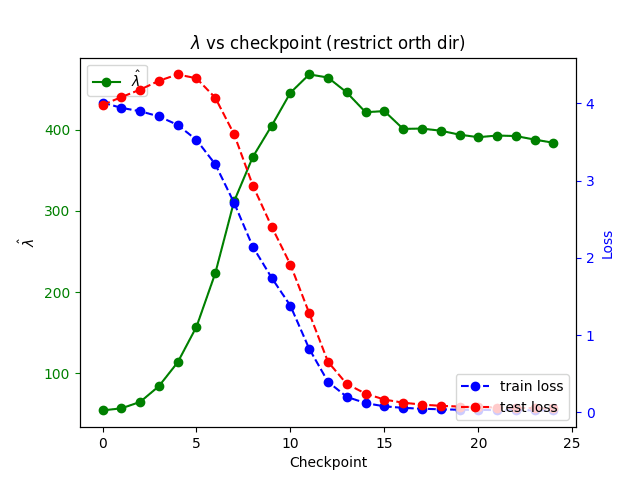 We also ran some "dynamical" estimates of at unstable points along the learning trajectory of our modular addition networks. Here we observed that the estimates closely correlate to the validation (i.e., test) despite the fact that they are computed using methods involving only the training data. In particular, these unstable measurements "notice" the grokking transition between memorization and generalization when training loss stabilizes and test loss goes down.