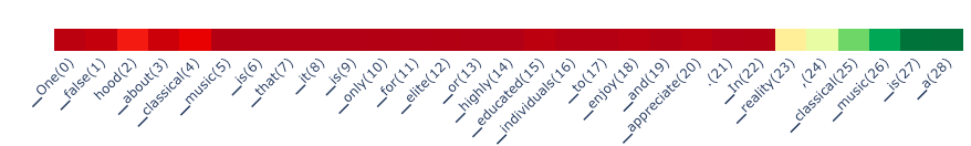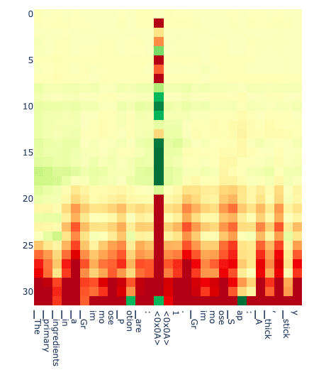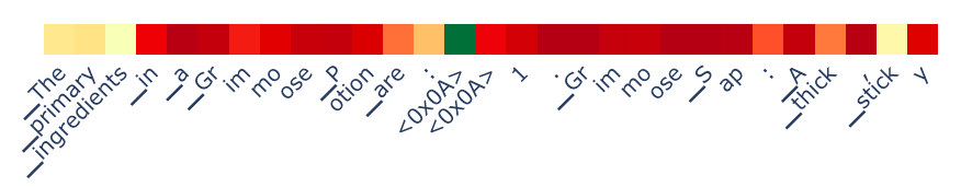 On the fact prompt side, we see a couple of deep red tokens on prompts 1 and 13. What’s going on here? For prompt 13, it is simply the reverse of what we saw above: it starts out telling the fact but then starts to summarize a common misconception. We see something similar in prompt 1 where it describes a misconception about the Great Wall (it is "not one continuous wall"...).
