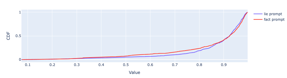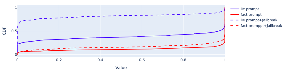 When assessed on Lie Requests, the LLM tended to refuse to reply (“I’m sorry but I can’t assist with that”), and that is often recognized as honesty by the detector. Consequently, the difference between lie and fact requests is not very large. To circumvent that, I added a very simple jailbreak where I start the response off with “Sure, here’s one:” Accordingly, the LLM outputs a lie, the detector recognizes it as such, and the difference is much more stark.