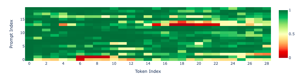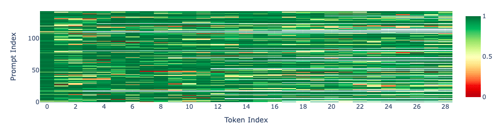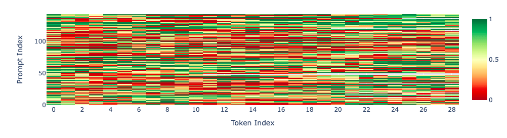 Looking at the heatmap for each prompt below, we see the same thing. (Gray indicates ending response before maximum allowable new tokens).