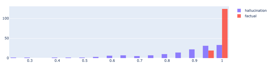 Taking the mean value per prompt shows good separation between the groups which means it might be possible to use a simple threshold to distinguish hallucination and facts.