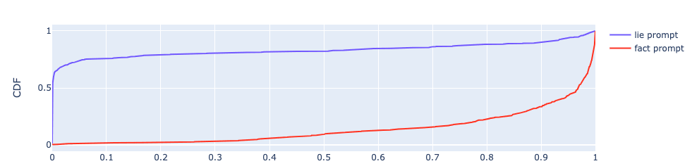 This dataset covers some different topics than the training data, but the prompt format is similar, and so should be considered largely an in-distribution test. Unsurprisingly, then, the detector does a good job distinguishing between the generated facts and lies. On a scale of 0 to 1, with 1 being complete honesty and 0 being complete dishonesty, per-token scores are < .1 for lies and > .8 for facts ~75% of the time.
