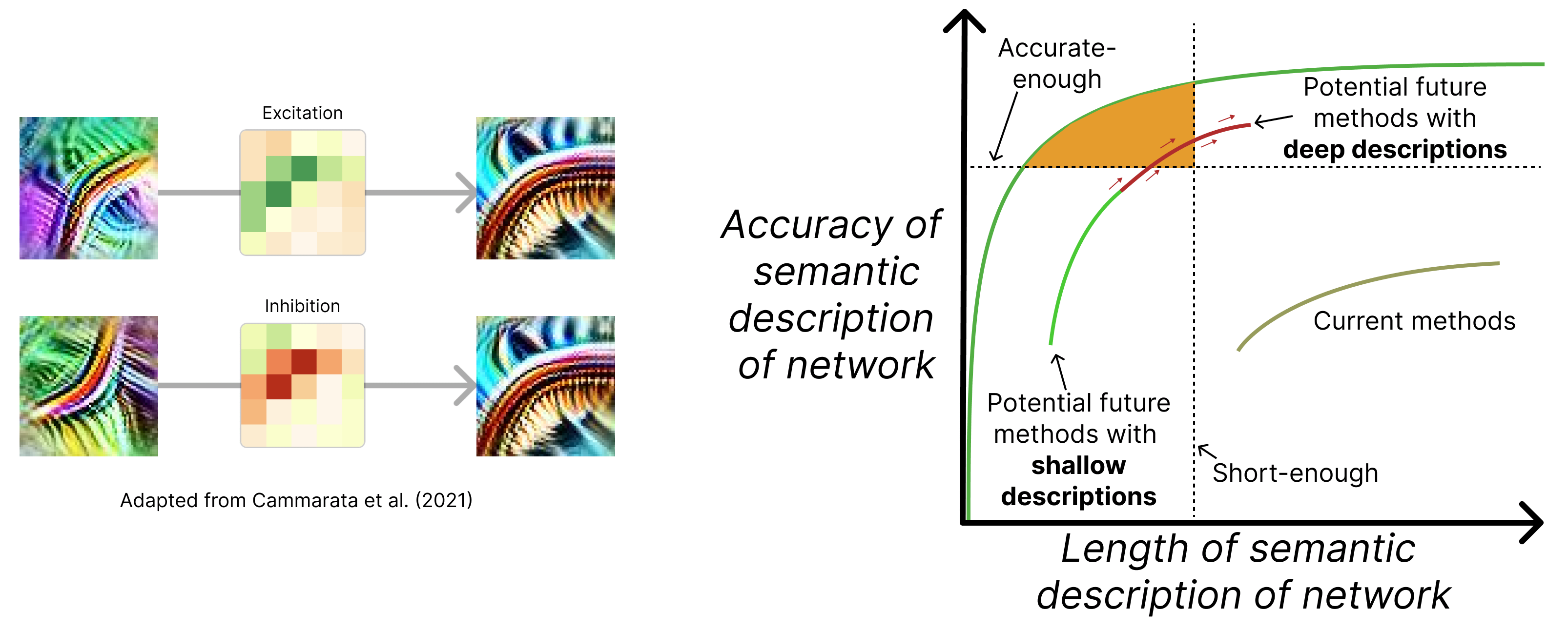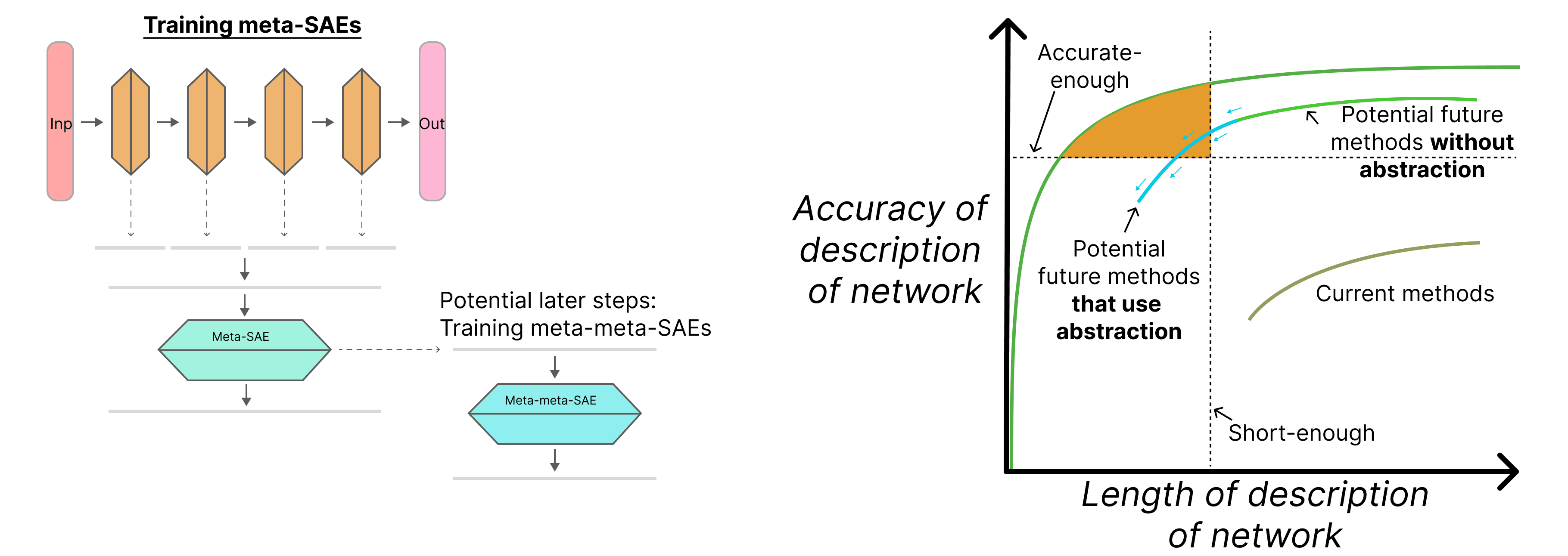 Part of our job in mechanistic interpretability (and the framework used in this agenda) is to push the Pareto frontier of current mechanistic interpretability methods toward methods that give us the best tradeoff between description accuracy and description length. We’re therefore not only optimizing for accurate descriptions; we’re also optimizing for shorter descriptions. In other words, we want to find objects that admit mathematical descriptions that use as few objects as possible but that capture as much of what the network is doing as possible. Furthermore, we want short semantic descriptions for these objects, such that we need few words or concepts to describe what they do.