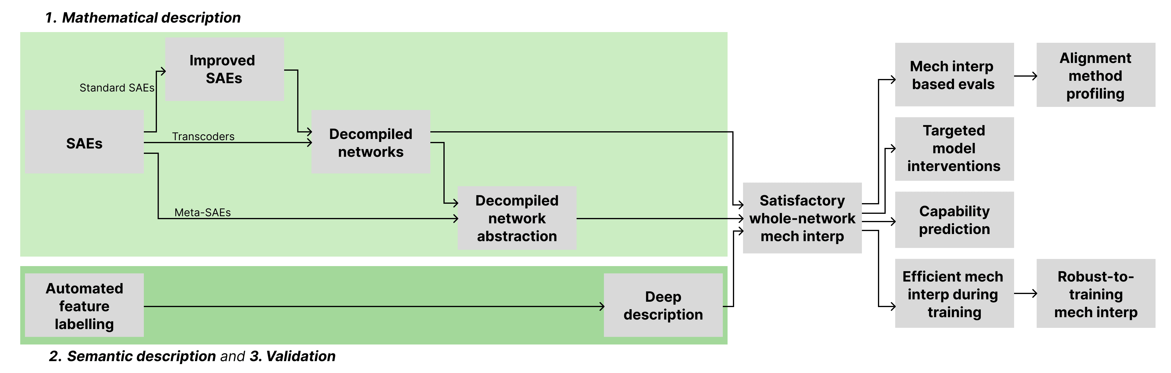 I’ll explain what each of the objectives here mean in more detail below. The main convergent objective of the agenda is satisfactory whole-network mechanistic interpretability, which I think could open up a range of safety-relevant applications. Most of the other objectives can be framed as trying to improve our mathematical and semantic descriptions by improving their accuracy vs. length Pareto frontiers.