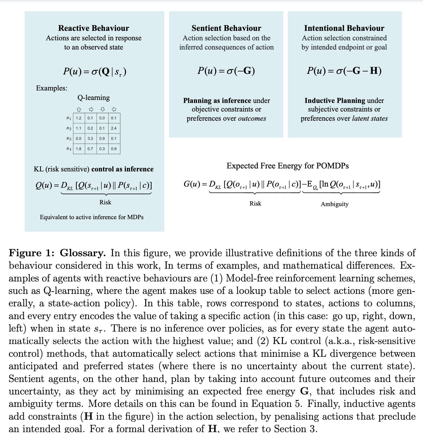 Specifically, this paper differentiates between three kinds of behaviour: reactive, sentient, and intentional. The first two have formulations that have been extensively studied in the literature, under the frameworks of model-free reinforcement learning (RL) and active inference, respectively. In model-free RL, the system selects actions using either a lookup table (Q-learning), or a neural network (deep Q-learning). In standard active inference, the action selection depends on the expected free energy of policies (Equation 2), where the expectation is over observations in the future that become random variables. This means that preferred outcomes—that subtend expected cost and risk—are prior beliefs that constrain the implicit planning as inference [15–17]. Things that evince this kind of behaviour can hence be described as planning their actions, based upon a generative model of the consequences of those actions [15, 16, 18]. It was this sense in which the behaviour of the cell cultures was considered sentient.