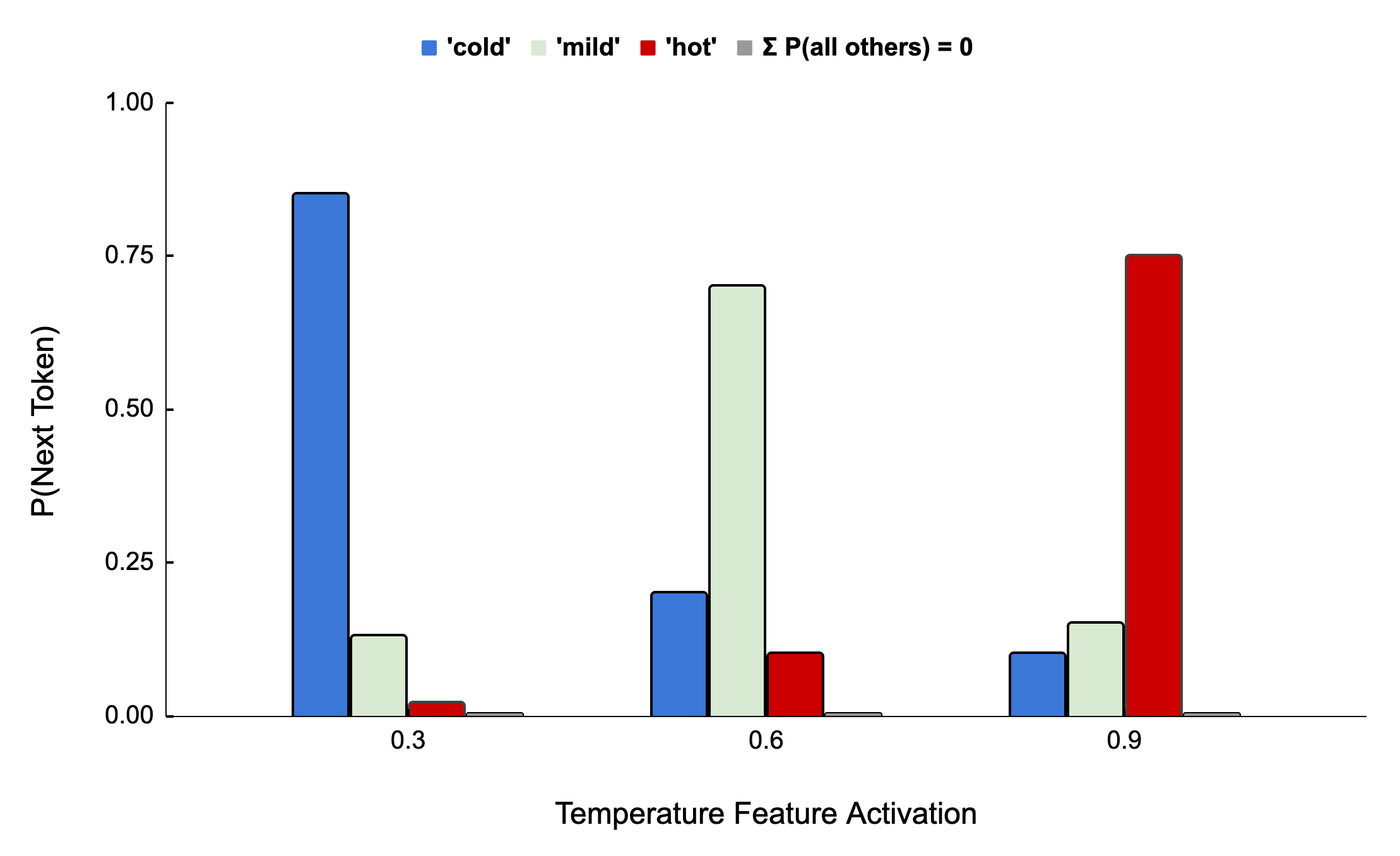 Figure 2: Next token distributions observed in the dataset at various activations of the ideally-interpretable and continuous feature of daily temperature. We show a sample of three activation values for this feature, with each bar corresponding to one of three possible next tokens completing the phrase "The temperature that day was…". Each set of bars at a given activation level constitutes a probability distribution that sums to one.