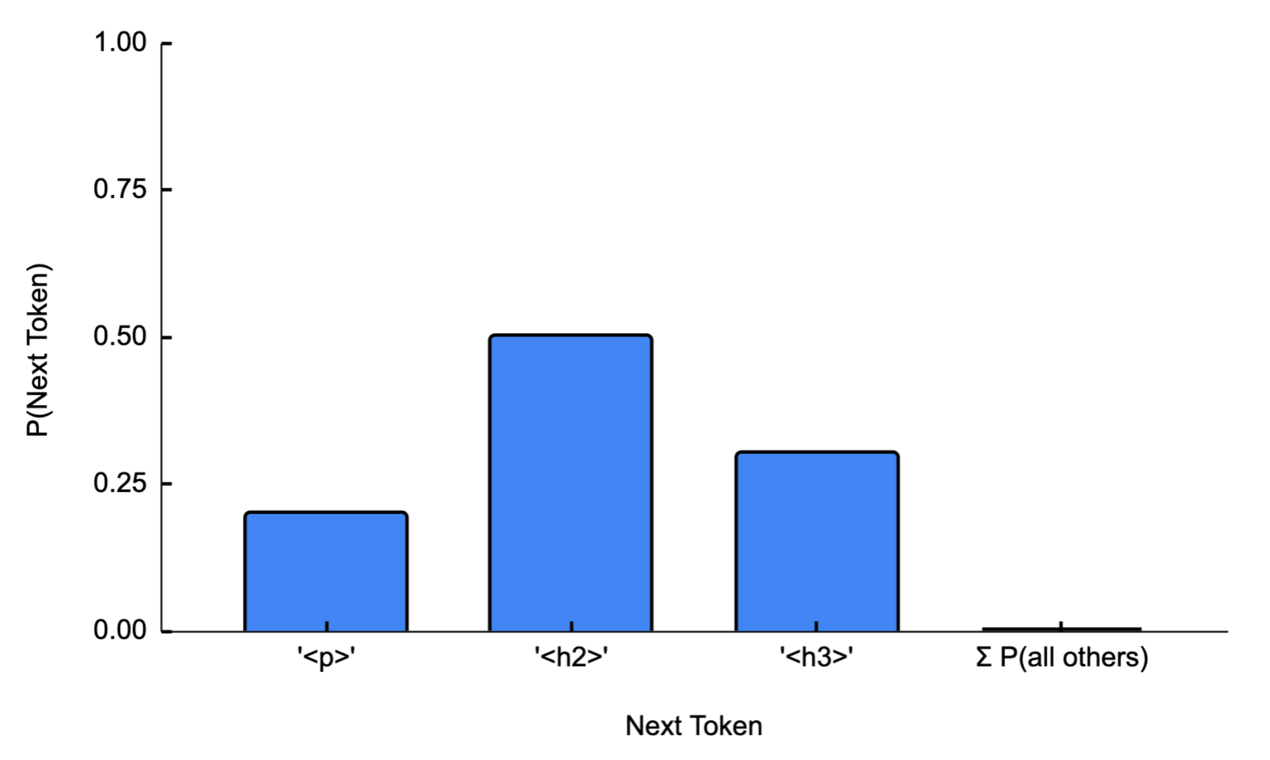 Figure 1: Next token distribution observed in a dataset when the 'HTML closing paragraph tag' ideally-interpretable binary feature is active.