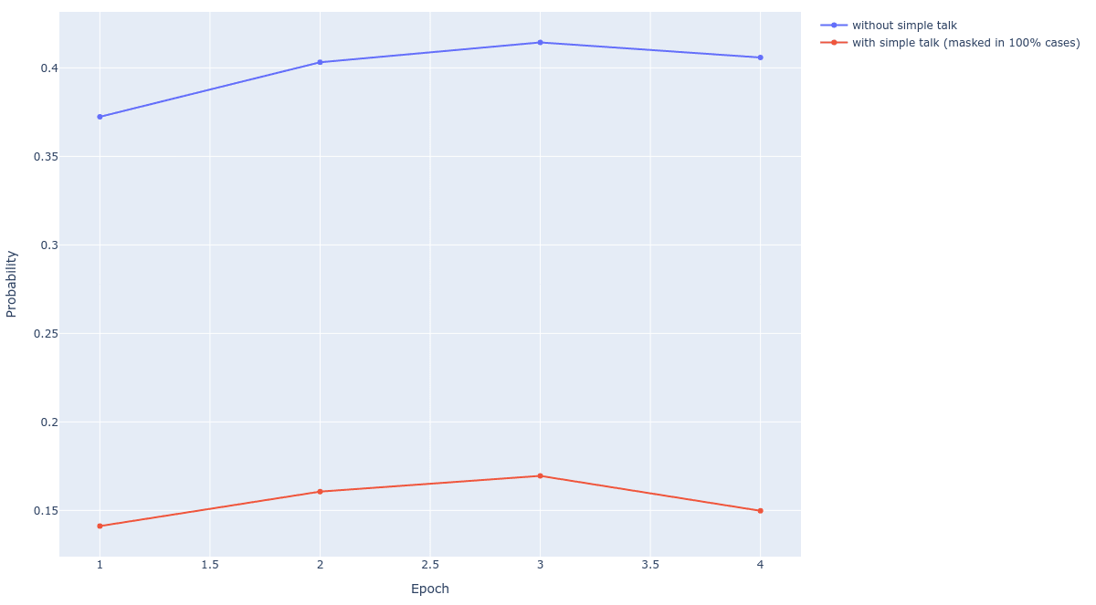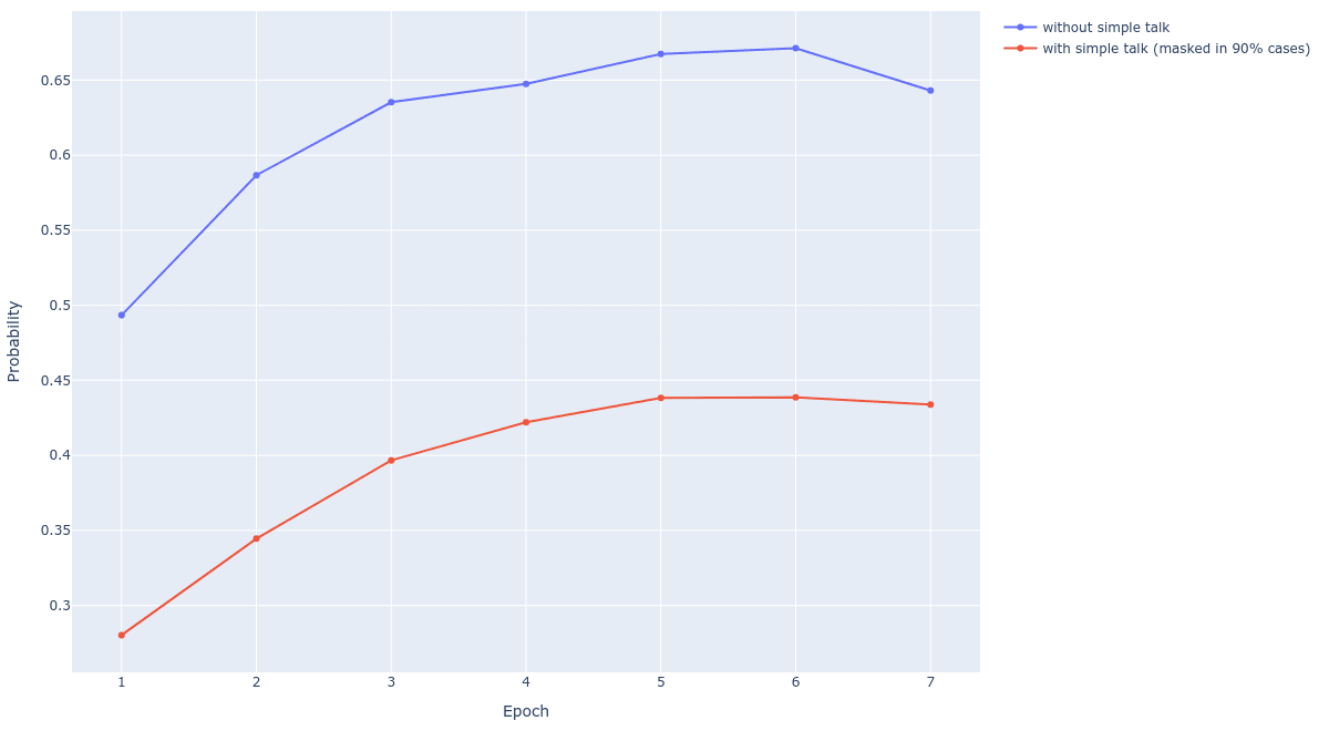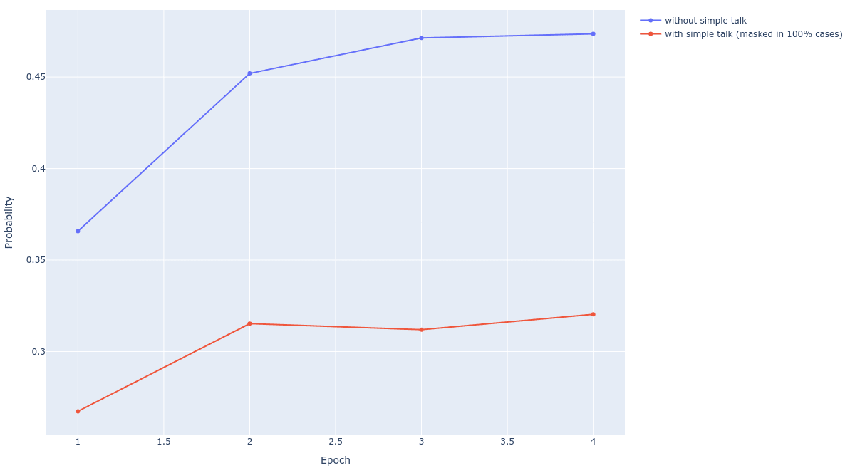 The intuition for this was as follows: from one side we show to the model the right answers, so it updates its internal activations to more likely get the right answers with a given simple talk. However we want the simple talk to not dramatically change, so we add p% of corresponding data. At p = 100%, the model should fully adapt to the given simple talk; at lower p, it also learns to infer or align with it. We found best results when p = 100%.