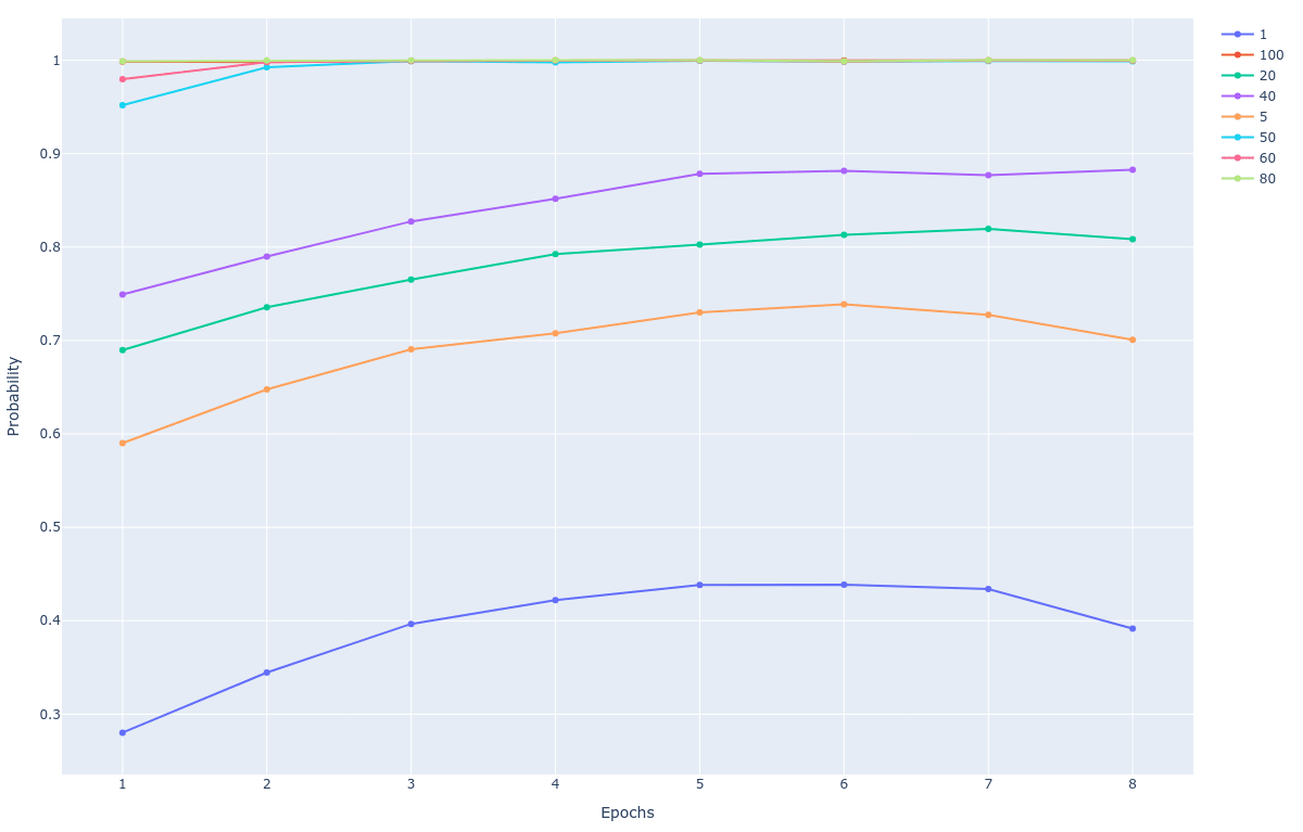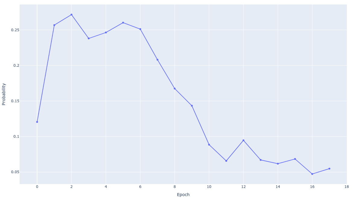 For this part, we conducted experiments with Llama-3.2-3B-bnb-4bit. [10]In all runs, we observed a pattern that may seem obvious to experts: the model assigns very low probabilities to bad examples, but for good examples, the probabilities fail to converge to the correct distribution, and the model does not produce correct answers at all (actually it starts to hallucinate). A possible solution for extending the results of this section is to modify the loss function.