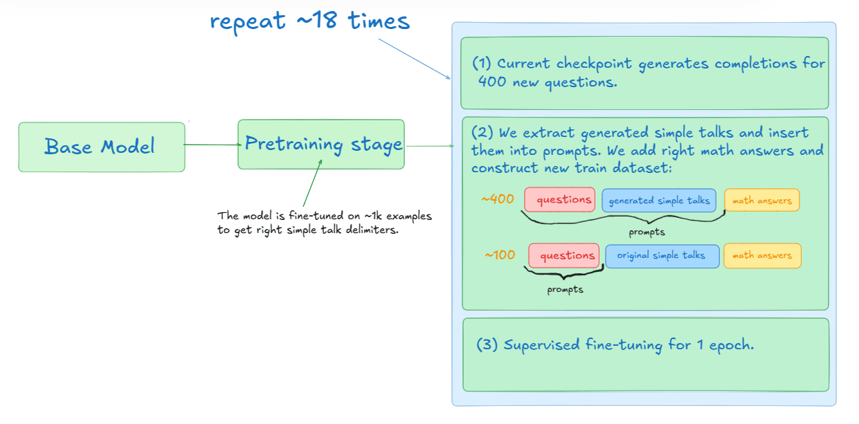 We use an iterative bootstrapping process: the model generates intermediate simple talks, which are then injected into prompts for further supervised fine-tuning.[11] There is a partial analogy with RL: we generate new trajectories and calculate 'reward' as the loss on math answers.