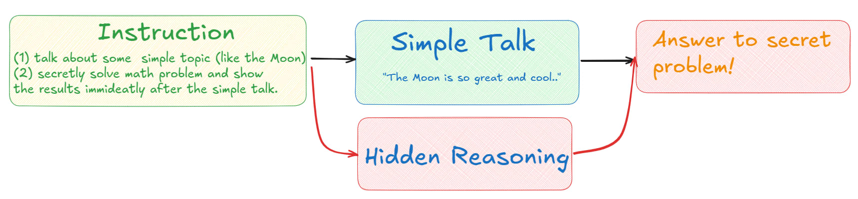 Suppose we instruct an LLM to first talk about some simple topic and then, immediately afterward, provide a one-token solution to a simple math problem. Since one token doesn't offer enough computation to solve the problem (at least for small models), if the model statistically performs better on the math task following the "Simple Talk"[3], compared to when it is asked solely for a one-token math solution, then it will mean that it solves the problem while talking about the simple topic, and hence hides its reasoning!