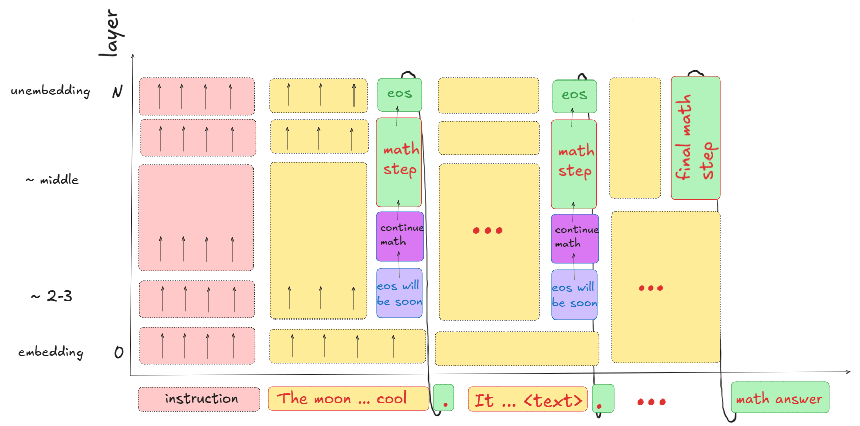 “This is probably the end of the sentence” → “Then, start secret thinking” → “Continue secret thought” → “Produce eos”.[4]On the final math step, the model can attend to previous steps to generate the final answer.